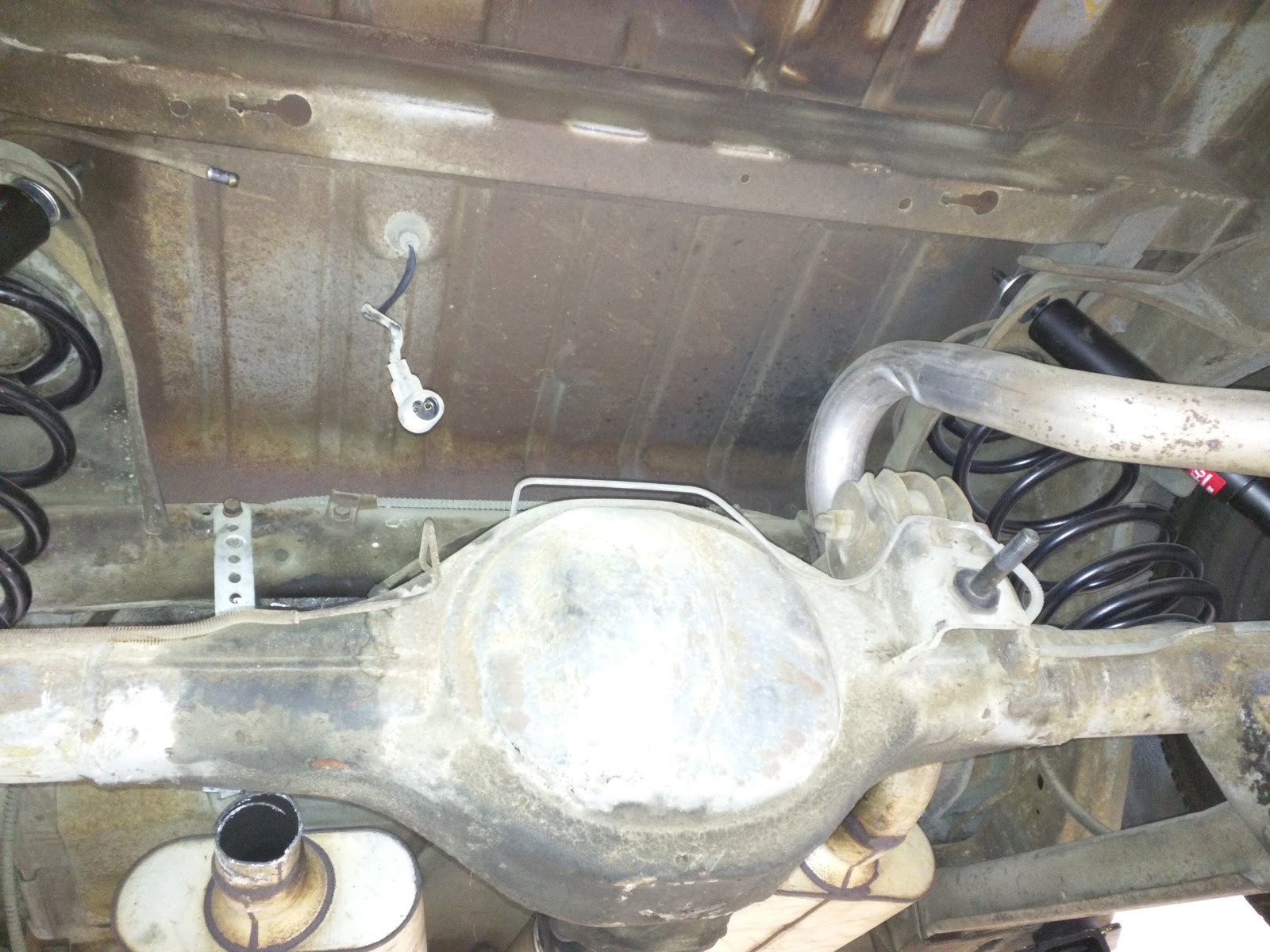 Here is a look from under the gas tank. I disconnected the feed line and the fuel level sender. The big tube thing on the right is one of the exhausts and the bar going across is the panhard bar. I'll go into more detail in a bit.